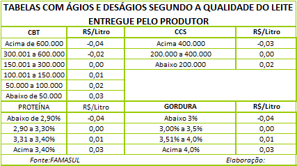 Obs: Outros parâmetros são considerados pelo mercado para estabelecer o valor final do leite a ser pago ao produtor, tais como: 1 – Fidelidade do produtor ao laticínio; 2 – Distância da propriedade até o laticínio; 3 – Qualidade da estrada de acesso à propriedade rural; 4 – Temperatura da entrega do leite; 5 – Capacidade dos tanques de resfriamento de leite da propriedade; 6 – Tipos de ordenha; 7 – Adicionais de mercado devido à oferta e procura pelo leite na região; 8 – Sazonalidade da produção; 9 – Condições sanitárias do rebanho; 10 – Outros benefícios concedidos pelas indústrias.