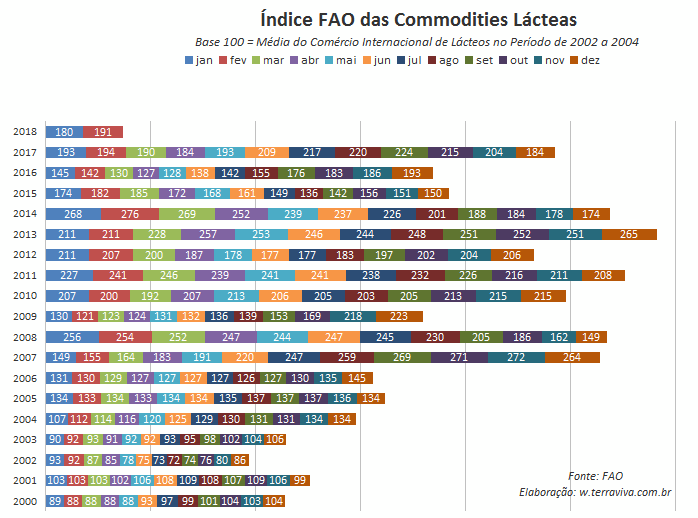 Assim o Índice FAO dos produtos lácteos atingiu 191,1 pontos em fevereiro, apresentando alta de 11,2 pontos em relação a janeiro, mas, ainda assim, ligeiramente menor que o índice de um ano atrás. As cotações internacionais das quatro categorias de produtos lácteos que compõem o índice aumentaram sob efeito da forte demanda de importação e uma produção menor do que a prevista na Nova Zelândia. O preço da manteiga, que atingiu o valor recorde em setembro de 2017, antes de cair por quatro meses consecutivos, subiu 6%. Também tiveram elevação os preços dos queijos e do leite em pó integral, sustentados por uma forte demanda na Europa e na Ásia, enquanto que a demanda mundial sólida de leite em pó desnatado fez os preços subirem.