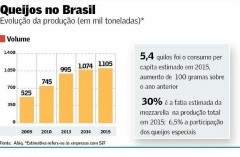 O número se refere aos queijos produzidos por empresas com SIF (Serviço de Inspeção Federal). A desaceleração tem duas razões, de acordo com a entidade: a escassez de leite no Brasil em 2015 e a queda no consumo no segundo semestre do ano passado em decorrência dos efeitos da crise econômica na renda da população brasileira. A Abiq mantém cautela sobre as estimativas para este ano. No entanto, as previsões iniciais indicam estabilidade na produção ou mesmo uma «eventual queda». Isso porque o cenário de falta de matéria­prima no país para produzir lácteos persiste assim como a demanda mais restrita por parte do consumidor. A associação, que reúne 60 empresas de queijos do país, pondera que o consumo do produto costuma crescer no período de inverno, o que também poderia influenciar a produção. A despeito da recente perda de «dinâmica» no consumo de queijos no Brasil, o CEO da Lactalis do Brasil Marek Warzywoda, avalia que «existe um potencial gigante para ampliar essa categoria» no mercado nacional. Os números do consumo per capita corroboram essa avaliação. Enquanto no Brasil, foram 5,4 quilos per capta ano passado, em países como Chile e Argentina, a demanda por habitante supera os 10 quilos, observa o executivo. Ele nota ainda que a maior parte do consumo no Brasil está focada em queijos básicos, como mozzarella em peça, queijo prato e requeijão. A Lactalis, no entanto, está focada em queijos finos, de maior valor. «Queremos desenvolver essas categorias [queijos finos] aqui no Brasil», afirma. Conforme os dados da Abiq, a mozzarella representa cerca de 30% da produção total de queijos no Brasil. Já os queijos finos têm uma fatia bem menor, de 6,5%. Levantamento da Eumonitor mostra que as vendas de queijos no varejo nacional em 2015 somaram R$ 19,406 bilhões.